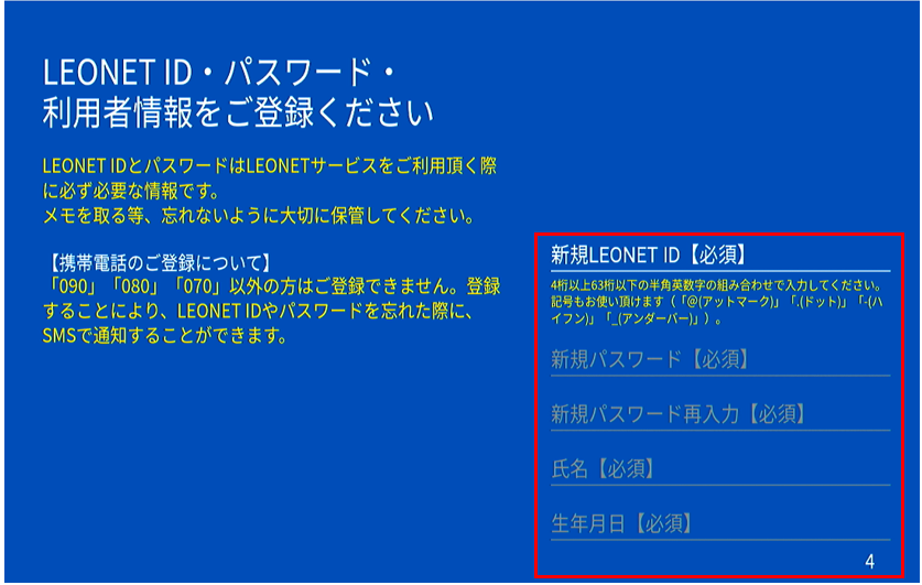 ※LEONETIDやパスワードを忘れた場合においてSMS認証を行うことで、電話番号ベースで確認が可能となります。