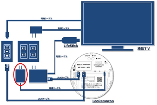 レオリモコンの再起動方法は、下記の赤○印のコンセントを抜き差ししてください。