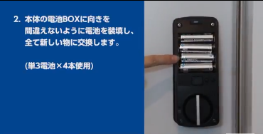 3)電池を4本全て新しい単3アルカリ電池に交換します。電池ボックスに電池を入れる際は、向きを間違えないように注意します。