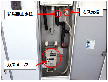 1)給湯器下の元栓 を閉めて、水を止めます。