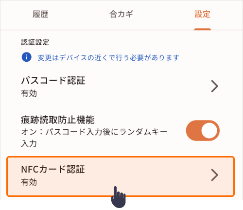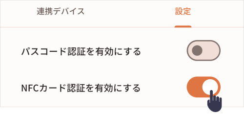 2)「設定タブ」を選択し、「NFCカード認証を有効にする」のつまみをON(右寄り)にします。