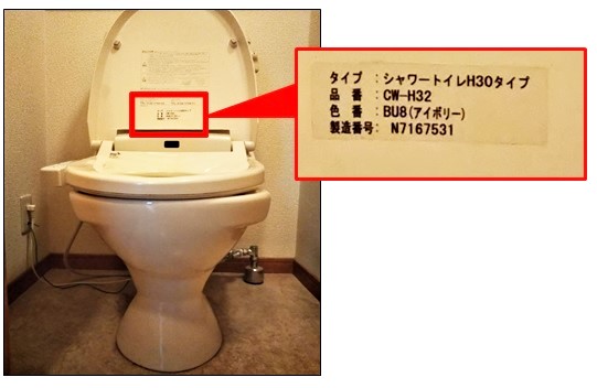 温水洗浄便座の型番は、主に便座の蓋内側にあるシールに「CW」「CH」「DL」「BE」「JCS」「TCF」といったアルファベット2~3文字から始まる番号で記載されています。
